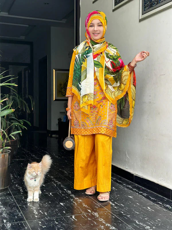 Embroidered Mustard On Fleek Stitched 3-Piece Dress – Stand Out with Vibrant Elegance